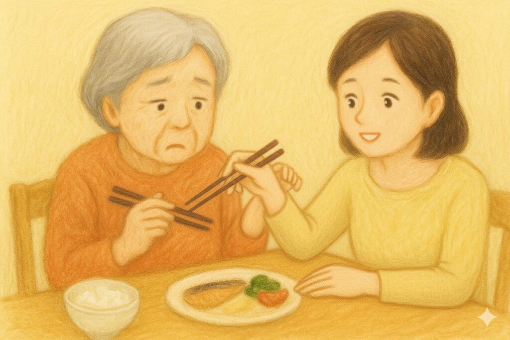 認知症が進んでくると、食事のときに動作が止まってしまい、