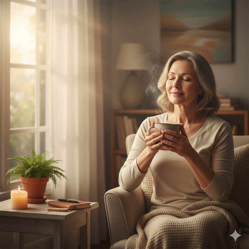 • 体を動かす:座ったまま肩甲骨を回したり、首をゆっくり伸ばしたり。凝りをほぐすと、心も緩みます。