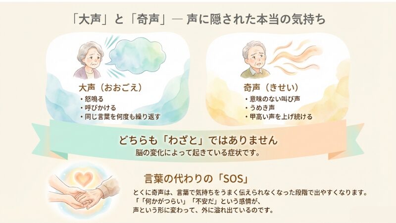 この記事では、認知症の奇声・大声が起きる理由と、