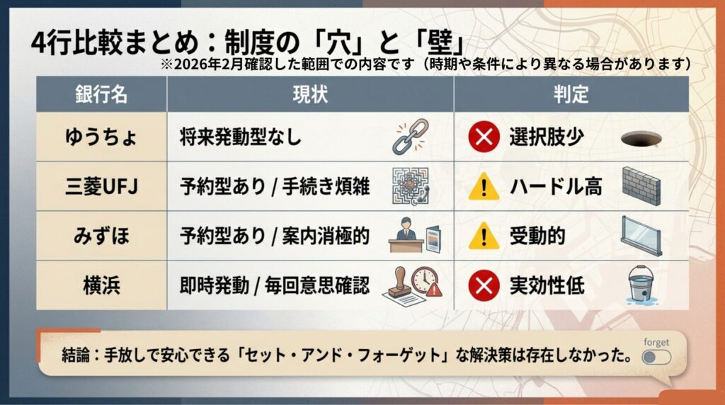 以下の表は2026年2月に窓口で聞いた情報で、判定はあくまで個人的なものです